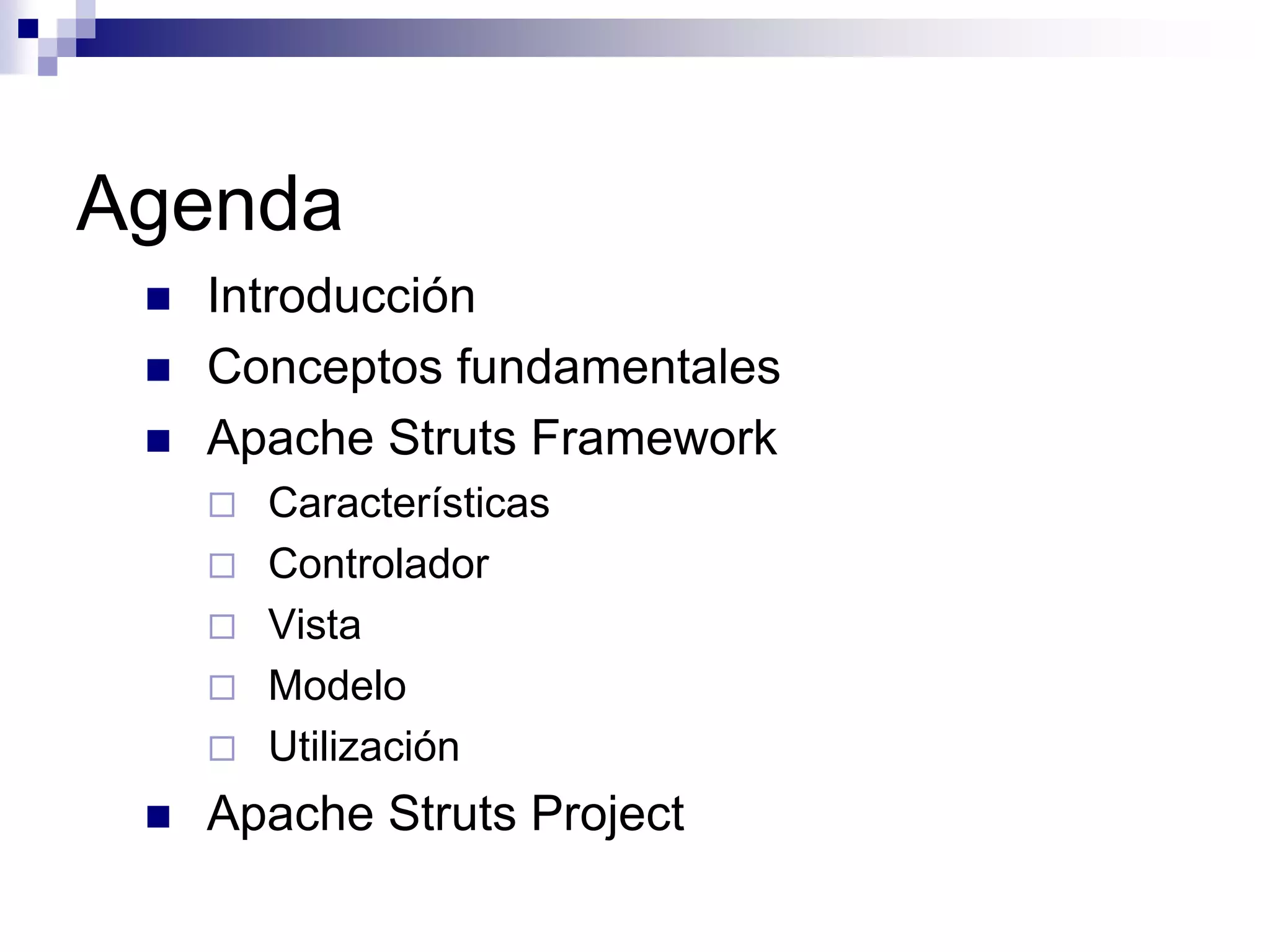 El documento describe el patrón de diseño MVC y el framework Apache Struts. Struts implementa el patrón MVC separando una aplicación web en tres componentes: el modelo, la vista y el controlador. El framework proporciona clases y archivos de configuración para crear aplicaciones web que sigan este patrón.