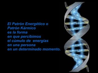 El documento describe el Patrón Energético o Patrón Kármico como la forma en que se percibe la acumulación de energías en una persona en un momento dado. Explica que esta energía se ha ido desarrollando y fortaleciendo a través de las diferentes existencias, y que atrae a las personas a situaciones y circunstancias perfectas para equilibrar sus energías. También menciona que las cualidades humanas como el amor y la dignidad son inherentes a la esencia humana y no se pueden perder, aunque a veces necesitan des