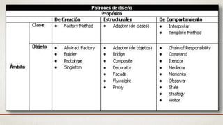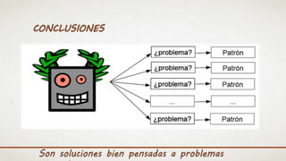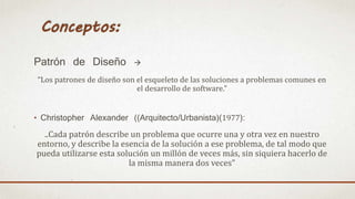 Los patrones de diseño describen soluciones probadas a problemas comunes en el desarrollo de software. Christopher Alexander definió un patrón como una solución a un problema particular que se puede utilizar repetidamente en diferentes contextos. Para ser considerada un patrón, una solución debe ser efectiva y reutilizable. El documento luego describe patrones fundamentales como Delegación, Interfaz, Singleton, Factory Method y otros, explicando sus problemas, soluciones y consecuencias.