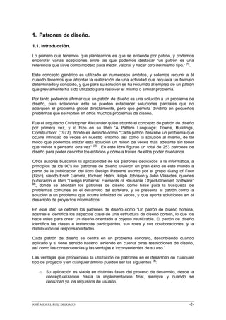 Este documento analiza los patrones de diseño en el e-learning, examinando primero los patrones en general y los patrones relacionados con el e-learning, luego estudia la organización de un centro dedicado a objetos de aprendizaje, y finalmente propone ejemplos de patrones teniendo en cuenta la experiencia de dicho centro.