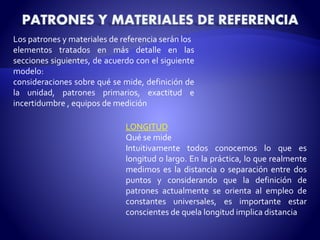 Este documento trata sobre los patrones de medición de diferentes magnitudes físicas como longitud, masa, temperatura, tiempo, electricidad, luz y radiometría. Define las unidades de cada magnitud y describe los patrones primarios, la exactitud e incertidumbre de las mediciones, y los equipos utilizados. Explica que la longitud se define como la distancia recorrida por la luz en el vacío, el kilogramo como la masa del prototipo internacional, el kelvin en relación al punto triple del agua, y el segundo basado en la radiación del cesio 133