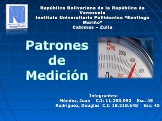 Este documento describe conceptos básicos sobre patrones de medición y su importancia en ingeniería. Explica que la medición implica comparar un patrón seleccionado con un objeto para determinar cuántas veces está contenido. Define patrones internacionales, primarios, secundarios y de trabajo, y cómo se usan los patrones en laboratorios para calibrar instrumentos y obtener lecturas confiables. También cubre tipos de error en mediciones y su relevancia para dimensionar elementos estructurales en ingeniería.