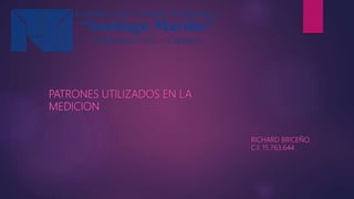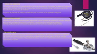 Este documento describe los diferentes tipos de patrones de medición, incluyendo patrones internacionales, primarios, secundarios y de trabajo. Explica que los patrones internacionales se definen por acuerdos internacionales y representan unidades de medida con la mayor precisión posible. Los patrones primarios se encuentran en laboratorios nacionales y representan unidades fundamentales. Los patrones secundarios y de trabajo se usan en laboratorios industriales para verificar y calibrar mediciones. También distingue entre mediciones directas e indirectas.