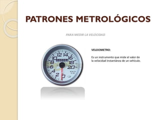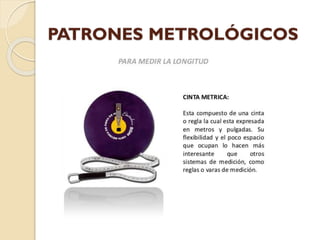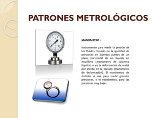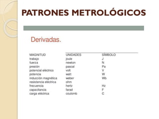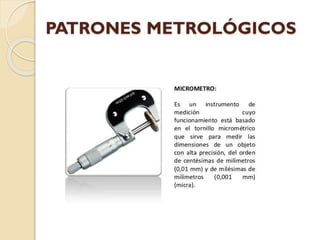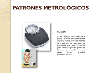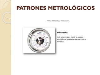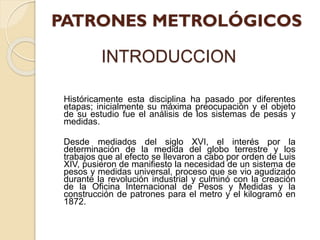 Este documento describe los patrones metrológicos utilizados para estandarizar las unidades de medida en todo el mundo. Explica que el kilogramo se define mediante un prototipo internacional y que el metro se define como la distancia recorrida por la luz en el vacío en un intervalo de tiempo específico. También cubre otros patrones como el kelvin, el amperio y el segundo.