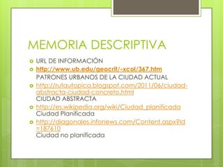 El grupo 3 presenta una memoria descriptiva sobre su proyecto de urbanismo que incluye patrones orgánicos y geométricos. Incluye URLs e imágenes de ciudades de referencia como Roma e imágenes y análisis de su maqueta abstracta que representa dos ciudades, una con patrones geométricos y otra con patrones orgánicos. Explica que la maqueta abstracta busca representar ideas importantes sobre la ciudad a través de la geometría y formas indefinidas.