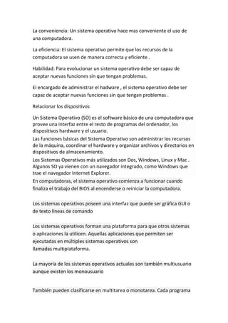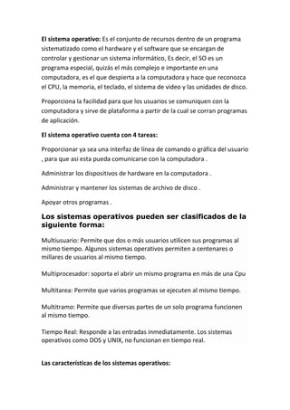 Un sistema operativo es el software básico de una computadora que provee una interfaz entre los programas, dispositivos hardware y el usuario. Los sistemas operativos más comunes son Windows, Linux y Mac. Administran los recursos de la máquina, coordinan el hardware y organizan archivos. Pueden clasificarse como monousuario, multiusuario, multitarea y más.