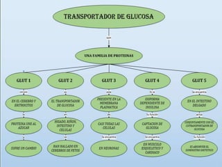 El documento describe los principales transportadores de glucosa (GLUT) en el cuerpo. GLUT1 se expresa en eritrocitos y células del cerebro. GLUT2 se expresa en el páncreas y hígado y ayuda a regular los niveles de insulina. GLUT3 se expresa en neuronas. GLUT4 se almacena en el citoplasma y se transloca a la membrana en presencia de insulina para permitir la entrada de glucosa a los músculos y tejido adiposo. El documento también resume las rutas aeróbicas y anaeró