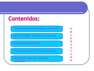 Este documento resume la estructura y organización general de la Prueba de Acceso a la Universidad (PAU) en España. Explica las diferencias entre acceso y admisión, la estructura de la PAU en dos fases (general y específica), y cómo se calcula la nota de admisión a los estudios universitarios de grado teniendo en cuenta las calificaciones obtenidas en cada fase. También incluye ejemplos numéricos para ilustrar el cálculo de la nota de admisión.