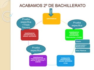 Este documento ofrece información sobre las opciones posteriores al Bachillerato, incluyendo estudios universitarios, formación profesional y enseñanzas artísticas superiores. También describe la Prueba de Acceso a la Universidad (PAU), sus fases y cómo se calcula la nota de admisión. Finalmente, incluye preguntas frecuentes sobre el proceso y recursos adicionales para la orientación universitaria.