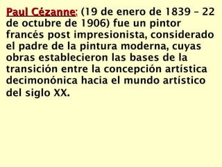 Paul Cézanne fue un pintor francés postimpresionista nacido en 1839 y fallecido en 1906, considerado el padre de la pintura moderna. Algunas de sus obras más importantes incluyen El rapto, El negro Escipión y Los jugadores de cartas.