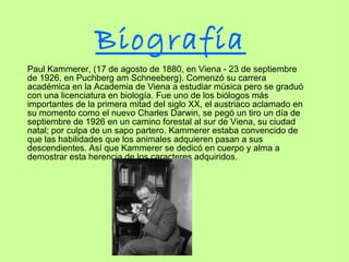 Este documento trata sobre el biólogo austriaco Paul Kammerer, conocido por su fraude científico en las décadas de 1920. Kammerer intentó demostrar la herencia de los caracteres adquiridos inyectando tinta negra en las patas de ranas para simular que habían desarrollado callosidades por el ambiente, cuando en realidad fueron añadidas artificialmente. Su fraude fue descubierto pero se suicidó poco después. El documento también menciona otros fraudes científicos como el de Hwang Woo Suk con células madre