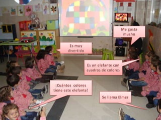Este documento presenta una serie de dibujos y frases cortas realizados por niños como parte de un proyecto escolar de 3 años en el Colegio San José de Palencia bajo la tutela de Isabel Calvo Redondo. Los dibujos y frases muestran diferentes temas como niños, una niña, peces, gatos, escarabajos, flores, la playa y un hombre que pinta cuadros de diferentes colores así como también patatas y gatos.