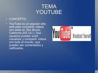 YouTube es un sitio web para compartir videos creado en 2005. Pronto se volvió el quinto sitio más visitado del mundo y fue comprado por Google en 2006 por $1.65 mil millones. Los usuarios pueden subir, ver y compartir videos de una gran variedad de contenidos.