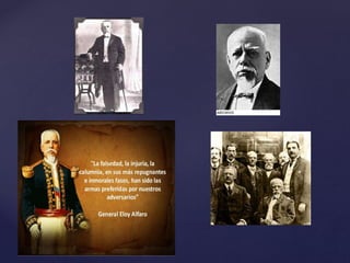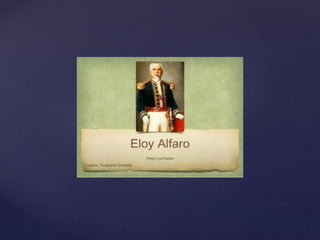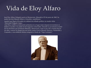 Eloy Alfaro nació en Montecristi, Ecuador en 1842. Recibió educación primaria y luego trabajó con su padre en negocios. Durante su juventud se identificó con el liberalismo anticlerical y luchó contra varios dictadores ecuatorianos como García Moreno. Pasó tiempo en el exilio en Panamá donde hizo una fortuna y se casó antes de regresar a Ecuador para continuar su lucha liberal, la cual incluyó varias campañas militares. Fue un líder importante en la revolución ecuatoriana y