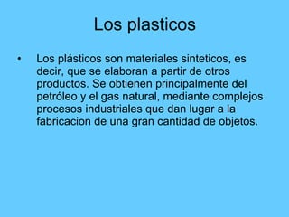 Este documento describe los diferentes tipos de plásticos, sus procesos de fabricación y tratamiento. Existen dos tipos principales de plásticos: termoplásticos, que pueden moldearse repetidamente al calentarlos, y termoestables, que solo pueden moldearse una vez. Los plásticos se pueden moldear por inyección, compresión, vacío, extrusión, soplado o calandrado. Existen diversas formas de unir piezas plásticas, como adhesivos, fusión o mecanización. Los residuos