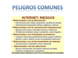 Este documento habla sobre los peligros de Internet, incluyendo el acceso fácil a drogas, manuales de bombas y pornografía, así como el ciberacoso y robo de identidad. También menciona que casi todos los niños y jóvenes son víctimas de acoso en un 95% y que es importante ser cuidadoso con la información que se publica en línea ya que puede ser usada para hacer daño. Finalmente, recomienda evitar enlaces sospechosos y sitios web dudosos, mantener actualizado el software y usar