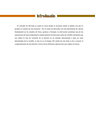 Este documento describe varias aplicaciones de la derivada en matemáticas, física y la vida cotidiana. Explica que la derivada mide la tasa de cambio de una función y puede usarse para estudiar tasas de variación, valores máximos y mínimos, y concavidad. También detalla algunos ejemplos de cómo se usa la derivada para calcular velocidad, tasa de crecimiento poblacional, y llenado de tanques.