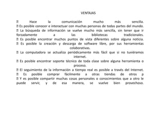 Internet es una red descentralizada de redes interconectadas que usan el protocolo TCP/IP para funcionar como una red lógica global. Se originó en 1969 con la conexión entre universidades en California y Utah. Un servicio popular es la World Wide Web, desarrollada en 1990, que permite la consulta remota de archivos de hipertexto usando Internet.