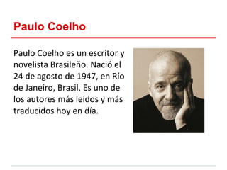 Paulo Coelho es un escritor y novelista brasileño nacido en 1947 en Río de Janeiro. Debido a la presión de su familia para que estudiara ingeniería en lugar de literatura, Coelho sufrió rebeldía y fue internado en un hospital psiquiátrico. Más tarde se involucró en el periodismo y el movimiento hippie, y llegó a ser encarcelado durante la dictadura brasileña por su participación en un cómic que favorecía la libertad. Después de casarse en 1979, Coelho decidió dedicarse