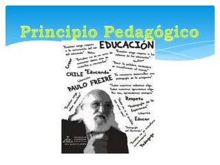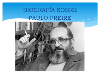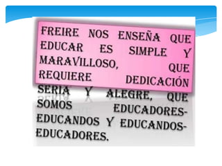 Este documento presenta información sobre Paulo Freire, un pedagogo brasileño. Resume que Freire creía en una educación basada en el diálogo entre maestros y estudiantes y que consideraba a los estudiantes como sujetos activos en su propio aprendizaje. Freire abogaba por una educación que empodere a los oprimidos y promueva la liberación a través de la concienciación crítica.