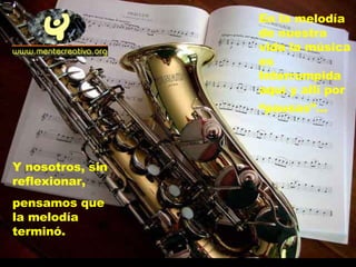 El documento habla sobre cómo las pausas en la vida, aunque parezcan interrupciones, en realidad ayudan a crear la melodía completa. A veces Dios pone pausas forzadas como pruebas o fracasos, pero Él sigue marcando el ritmo y la melodía continúa. Nuestra tarea es aprender la lección y no desanimarnos durante las pausas, confiando en que Dios dirige nuestra vida hacia una melodía completa.