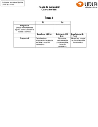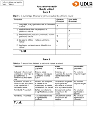 Este documento presenta una pauta de evaluación para la cuarta unidad de segundo básico. Contiene tres ítems que evalúan la capacidad de los estudiantes para diferenciar el patrimonio cultural del natural, distinguir entre ambos y explicar la importancia de cuidar la naturaleza. El primer ítem contiene preguntas sobre patrimonio cultural y natural. El segundo ítem incluye actividades para identificar ejemplos de cada tipo de patrimonio. El tercer ítem evalúa la habilidad de dibujar plantas nativas y argumentar sobre la importancia de