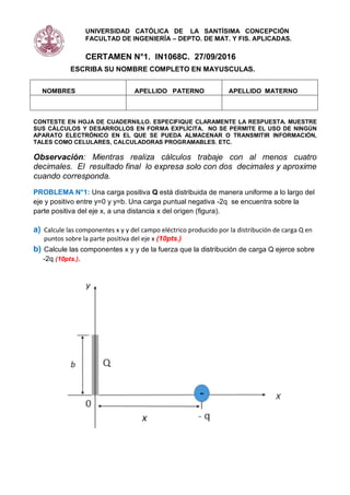 Este documento presenta 3 problemas relacionados con campos eléctricos y distribuciones de carga. El primer problema involucra calcular el campo eléctrico y la fuerza debido a una carga distribuida uniformemente. El segundo problema trata sobre encontrar el campo eléctrico en una región y las densidades superficiales de carga en superficies esféricas. El tercer problema consiste en determinar la constante de una distribución de carga lineal y calcular la fuerza en una carga puntual.