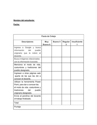 El estudiante buscará información sobre un pueblo originario designado por el docente en Google e imágenes relacionadas. Reportará el modo de vida, costumbres y tradiciones del pueblo encontrado. Usará Power Point para presentar lo encontrado y enviará el trabajo final al pendrive del docente.