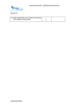 Este documento es un instrumento de monitoreo para evaluar el cumplimiento de la cobertura curricular de un docente. Contiene 19 indicadores como puntualidad, cumplimiento de horas de clase, registro de asistencia de estudiantes, colaboración en actividades del establecimiento, entre otros, que son evaluados con una calificación de si o no. El propósito es monitorear el desempeño docente y su cumplimiento de las responsabilidades educativas.