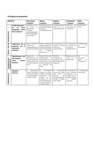 El documento presenta las instrucciones para la realización de un documental sobre temas de historia contemporánea de Chile entre 1970 y la actualidad. Sugiere formar grupos para definir un tema, su contexto espacial y temporal, los actores involucrados y la pregunta orientadora. Explica las etapas de preproducción, rodaje, postproducción y presentación, con énfasis en la coherencia argumental y la importancia del documental para rescatar la memoria histórica chilena.