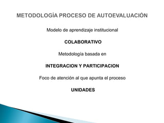 El documento presenta las fechas clave del proceso de autoevaluación institucional, que incluyen las jornadas de inicio y cierre, así como la entrega del informe final. Describe que la metodología será colaborativa e integradora, enfocada en las unidades, considerando la misión, visión y lineamientos estratégicos. Detalla los componentes que deben incluir los informes de autoevaluación de cada unidad, como el organigrama, objetivos, metas, procesos, análisis DOFA y plan de mejora.