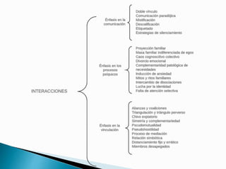 El documento describe los conceptos clave de sistema familiar, incluyendo sus subsistemas, límites, comunicación y problemas. Explica que la familia es un sistema dinámico constituido por elementos en interacción. Analiza los tipos de límites familiares y cómo afectan su funcionamiento. También describe patrones de interacción como alianzas y triangulaciones que influyen en la dinámica familiar.