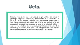 El grupo de trabajo tiene como meta profundizar en temas de psicología cognitivo conductual y sus diversas técnicas de una manera clara y coherente para proveer información oportuna que sirva como herramienta en la vida profesional y oriente a personas en medicina y psicología clínica. El portafolio pretende alcanzar el 95% de la nota a través de participación, controles de lectura y productos escritos. Su realización es importante para el desarrollo profesional y personal al adquirir conocimientos sobre aplicación de