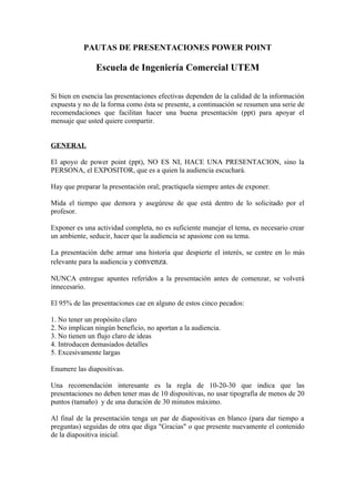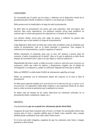 Este documento proporciona pautas para realizar presentaciones efectivas en PowerPoint. En resumen: 1) La presentación debe contener una historia clara con un propósito definido para captar la atención de la audiencia. 2) Cada diapositiva debe enfocarse en una sola idea principal con texto, imágenes y gráficos simples. 3) El contenido debe ser relevante y sustentado con evidencia mientras se mantiene un formato visual consistente y legible.