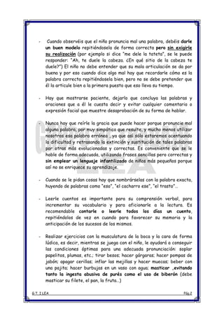 Este documento ofrece consejos generales para los padres sobre cómo apoyar el desarrollo del lenguaje en los niños. Recomienda que los padres proporcionen oportunidades para que los niños hablen mediante el uso del lenguaje en situaciones cotidianas como el baño o la comida. También sugiere elogiar los intentos del niño de hablar aunque no lo haga correctamente, y modelar el uso de palabras correctas sin corregir al niño directamente. Leer cuentos regularmente también es importante para ampliar el vocabulario del niño y f