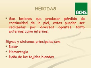 El documento habla sobre diferentes tipos de heridas y su clasificación. Describe heridas abiertas y cerradas, simples y complicadas, así como clasificaciones por agente causal como cortantes, punzantes, etc. Explica signos y síntomas de hemorragias, esguinces, luxaciones, fracturas y quemaduras. Finalmente, ofrece recomendaciones sobre el transporte adecuado de lesionados.