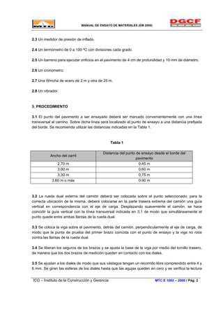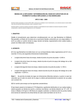 Este documento describe el procedimiento para medir la deflexión y determinar el radio de curvatura de un pavimento flexible usando una viga Benkelman. Explica los pasos para colocar el camión de prueba, posicionar la viga, tomar lecturas de los diales, y calcular la deflexión bajo el eje de la carga, la deflexión a 25 cm del eje, y el radio de curvatura del pavimento. El informe debe incluir los resultados de cada prueba así como la temperatura y estado del pavimento.