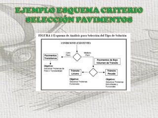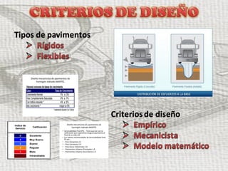 Este documento presenta una guía para el diseño de pavimentos. Describe varios métodos y criterios para el diseño de pavimentos como la Asociación de Cemento Portland (PCA), la Asociación Americana de Funcionarios de Carreteras y Transporte (AASHTO) y el método CBR. También cubre conceptos como el tránsito de diseño, suelos de subrasante, clima, drenaje y vida útil del pavimento.