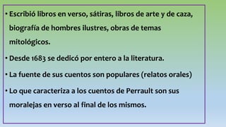 Charles Perrault fue un abogado y escritor francés del siglo XVII que escribió varios cuentos populares, incluyendo "Caperucita Roja", "La Bella Durmiente", y "Pulgarcito". Sus cuentos se caracterizan por incluir moralejas al final y tomar inspiración de cuentos populares orales. Perrault publicó sus cuentos en 1697 en el libro "Cuentos de hadas", ayudando a popularizar este género de literatura infantil.