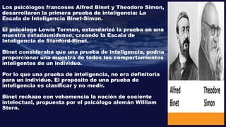 El documento aborda el desarrollo histórico de las pruebas de inteligencia, comenzando con Alfred Binet y su crítica al cociente intelectual, y proponiendo la teoría de las inteligencias múltiples de Howard Gardner, que argumenta que la inteligencia no es un único constructo. Se describen diversas inteligencias, como la lingüística, lógico-matemática y espacial, y sus respectivas localizaciones en el cerebro. También se crítica el sistema educativo actual en Iberoamérica por ser unidimensional y se sugiere que la educación debería centrarse en potenciar las fortalezas individuales de los estudiantes.