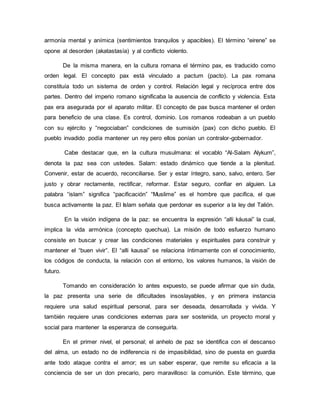 El documento describe diferentes concepciones de paz en diferentes culturas como la hebrea, griega, romana, musulmana e indígena. Luego discute que la paz requiere una salud espiritual personal y condiciones externas como justicia social. Finalmente, propone que para recuperar la paz en las organizaciones se debe fomentar la verdad, unidad, respeto y amor entre los empleados.
