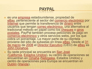 PayPal es una empresa estadounidense fundada en 1998 que permite transferencias de dinero entre usuarios a través de correo electrónico como alternativa a los métodos tradicionales. Procesa pagos en comercio electrónico cobrando comisiones. Fue adquirida por eBay en 2002 y tiene su sede principal en San José, California.