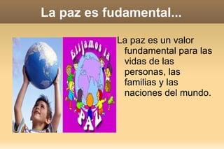 El documento trata sobre el tema de la paz. Explica que la paz es un valor fundamental para las personas y las naciones. Señala que la paz comienza desde el interior de cada persona más que de decisiones externas. También menciona que el Premio Nobel de la Paz se otorga a quienes trabajan por la fraternidad entre las naciones y procesos de paz. El primer ganador fue Jean Henry Dunant en 1901. Finalmente, resalta la importancia de defender la paz uniéndose y dejando las armas.