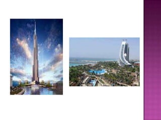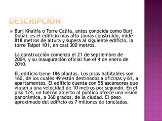 El Burj Khalifa es el edificio más alto jamás construido con 828 metros de altura, superando al segundo edificio más alto por casi 300 metros. Comenzó su construcción el 21 de septiembre de 2004 y fue inaugurado oficialmente el 4 de enero de 2010 en Dubái, Emiratos Árabes Unidos. Tiene 186 plantas, incluyendo 160 plantas habitables con 49 oficinas y 61 apartamentos.