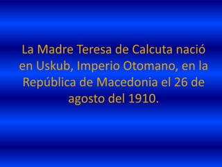 Este documento presenta información biográfica sobre Madre Teresa de Calcuta y Mahatma Gandhi. Describe que Madre Teresa de Calcuta, cuyo nombre real era Agnes Gonxha Bojaxhiu, dedicó su vida a ayudar a los pobres en Calcuta después de enseñar durante 20 años en un convento irlandés. También menciona que Mahatma Gandhi nació en la India británica en 1869 y murió en 1948, y que una de sus famosas frases fue sobre el esfuerzo siendo más importante que el resultado