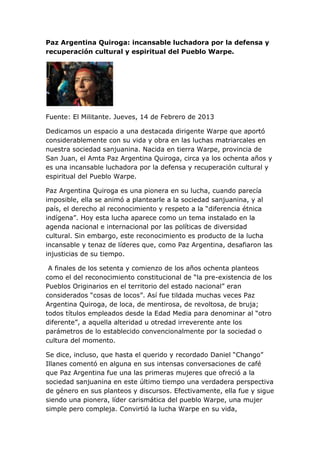 Paz Argentina Quiroga es una destacada líder del pueblo warpe que ha luchado incansablemente por el reconocimiento de los derechos y la cultura indígena en Argentina. A lo largo de su vida, ha defendido la identidad warpe y ha promovido la educación intercultural, siendo pionera en la organización y activismo social en su comunidad. Su trabajo ha sido fundamental para visibilizar las demandas de los pueblos originarios, inspirando un cambio en la agenda cultural y política del país.