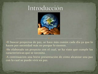 El proyecto busca lograr la paz interior y entre las personas a través de tres etapas: 1) cambiarse a sí mismo desarrollando la voluntad y el carácter; 2) aplicar ese cambio interno para alcanzar la paz personal; y 3) transmitir ese mensaje de paz a las comunidades y al mundo.