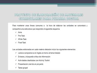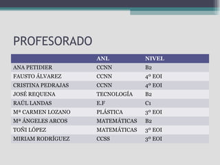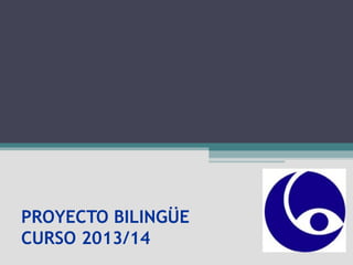 Este documento presenta el proyecto bilingüe para el curso 2013/14 en un instituto, incluyendo la asignación de profesores a diferentes niveles y materias, así como información sobre los auxiliares de conversación. Todos los alumnos de 1o de ESO formarán parte del programa bilingüe. Se trabajará con diferentes niveles de inglés y se adaptarán los contenidos y exámenes. El auxiliar irlandés apoyará al profesorado y los alumnos de 4o ESO que se preparan para el examen B1 de