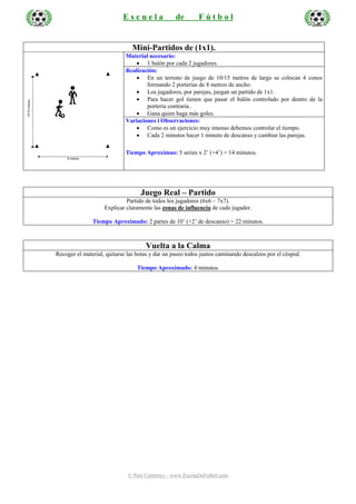 Este documento presenta un plan de entrenamiento de fútbol de 60 minutos que incluye ejercicios para mejorar el control del balón y los pases, partidos 1 contra 1, un partido completo y tiempo para descansar y beber agua. Los ejercicios se enfocan en conducir el balón manteniendo la vista en alto, realizar pases a través de conos u objetivos pequeños, y mini partidos individuales.