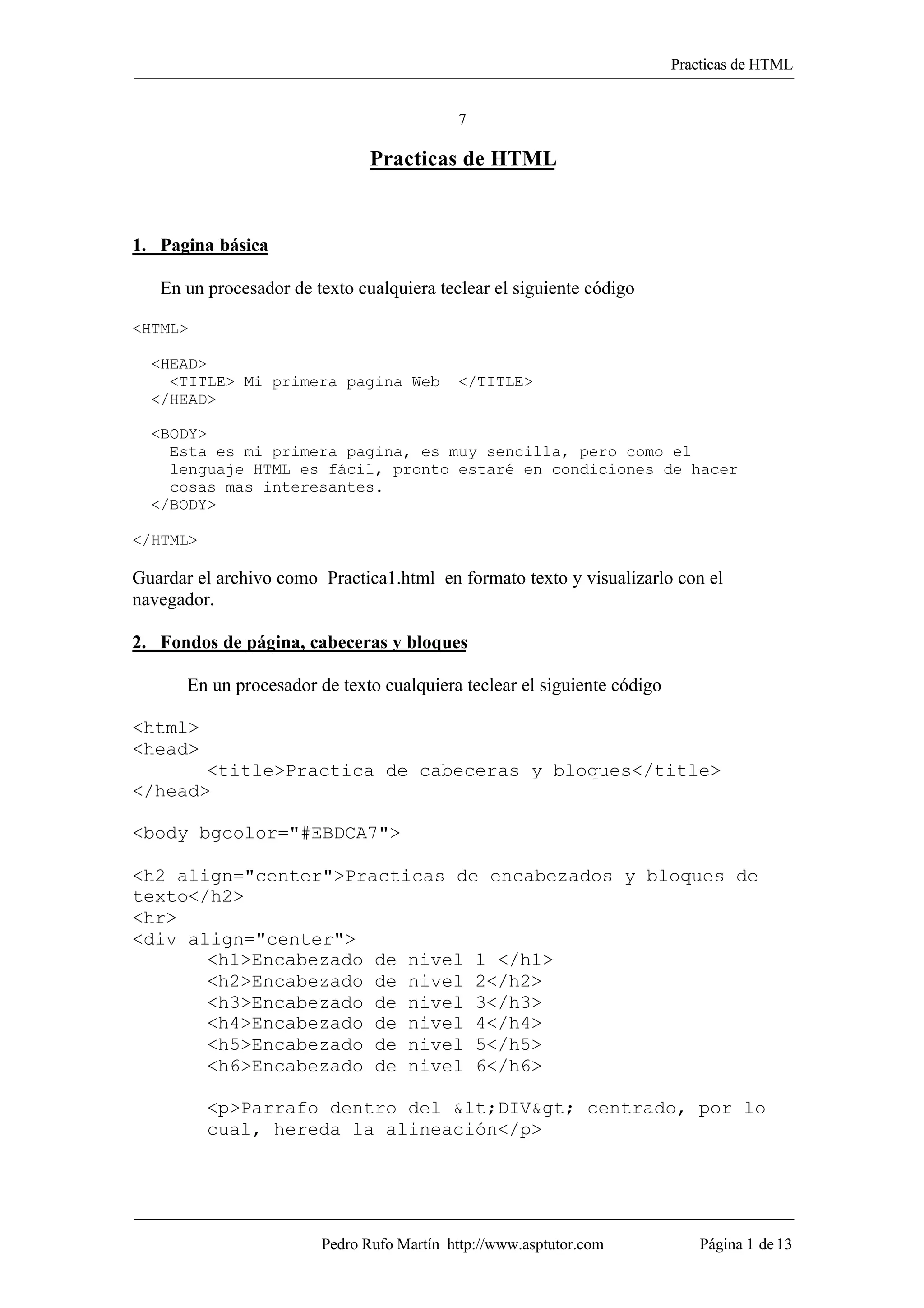 Este documento presenta 7 prácticas básicas de HTML para crear páginas web. La práctica 1 explica cómo crear una página básica. La práctica 2 cubre los fondos, encabezados y bloques de texto. La práctica 3 trata sobre los resaltados de texto y controles de fuente. La práctica 4 explica las listas. La práctica 5 cubre los hipervínculos e imágenes. La práctica 6 explica el uso de tablas. La práctica 7 presenta los